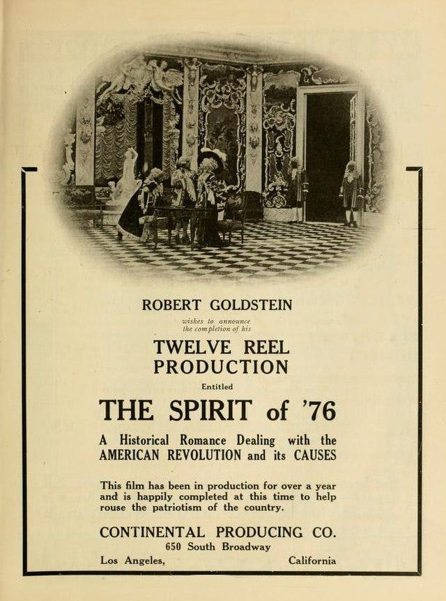 The Espionage Act empowered the government to extend censorship to motion pictures as well. In Los Angeles, Robert Goldstein, a native Californian of German-Jewish descent who had worked on D.W. Griffith’s Ku Klux Klan apologia film Birth of a Nation, had been working on his own silent film on the American Revolution, called the Spirit of ’76, since around 1915. The film revolved around a fictitious affair between King George III and a common Quaker woman and featured scenes of brutality on the part of British troops, including bayoneting a baby. The film premiered in Chicago, after which Goldstein was told by Chicago’s Police Censor Board to remove several scenes. He complied in Chicago but showed the uncensored version at the Los Angeles premiere a few months later, at which point he was indicted under the federal Espionage Act.