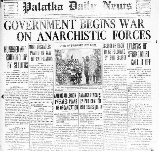 In early 1919, Attorney General Gregory stepped down, “to the great relief of progressives,” and was replaced by former Pennsylvania congressman A. Mitchell Palmer, who convinced Wilson to grant clemency to more than one hundred people who were serving Espionage Act sentences.[56] But on the night of June 2, 1919, Palmer was one of a number of high-ranking officials whose homes were targeted by a well-coordinated attack involving pipe bombs. While Palmer and his family were luckily unharmed, the attack, which destroyed the entire façade of his house, left him “profoundly transformed.” The perpetrators were never found, but Palmer found great political advantage in attacking the Wobblies and the Socialists, along with all the other usual suspects.[57] Following a summer of race riots across the country, most of them instigated by whites, by November, Palmer was reporting to the U.S. Senate that “[a]t this time, there can no longer be any question of a well-concerted movement among a certain class of Negro leaders of thought and action to constitute themselves a determined and persistent source of radical opposition to the Government, and to the established rule of law and order…The Negro is ‘seeing red.’”[58]