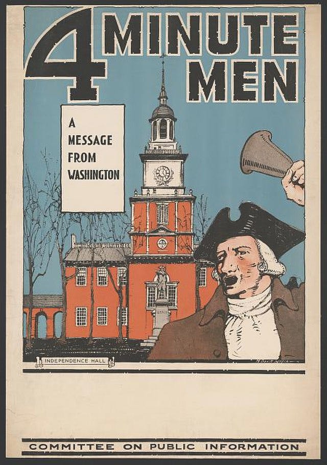 Nonetheless, his purpose writ large was to “sell” or “advertise” the Wilson Administration’s war effort and everything needed to support it, including the purchase of Liberty War Bonds. The “Four Minute Men” were recruited among local, trusted public figures (mostly men, but some women, including the actress Mary Pickford) to speak personally to motion picture audiences about the importance of supporting the war effort, using talking points prepared for them by the CPI, during the four minutes that it typically took for the theater projectionist to change reels. Special “Junior Four Minute Men Bulletins” were distributed to educators for use with school children. [19] The journalist Mark Sullivan later observed that “it became difficult for half a dozen persons to come together without having a Four Minute Man descend upon them.”[20] How far some of them may have strayed from the talking points over millions of public addresses is anyone’s guess.