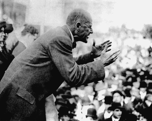 Then, on June 16, 1918, 62-year-old IWW co-founder and longtime Socialist presidential candidate Eugene V. Debs gave a barn-burner of a speech at the Ohio State Socialist Party Convention. While he railed against German imperialism, he also declared that “our hearts are with the Bolsheviki of Russia,” and “[f]rom the crown of my head to the soles of my feet I am a Bolshevik and proud of it.” He then said what would later be interpreted as urging people to resist the draft: “You need at this time especially to know that you are fit for something better than slavery and cannon fodder.”[46]